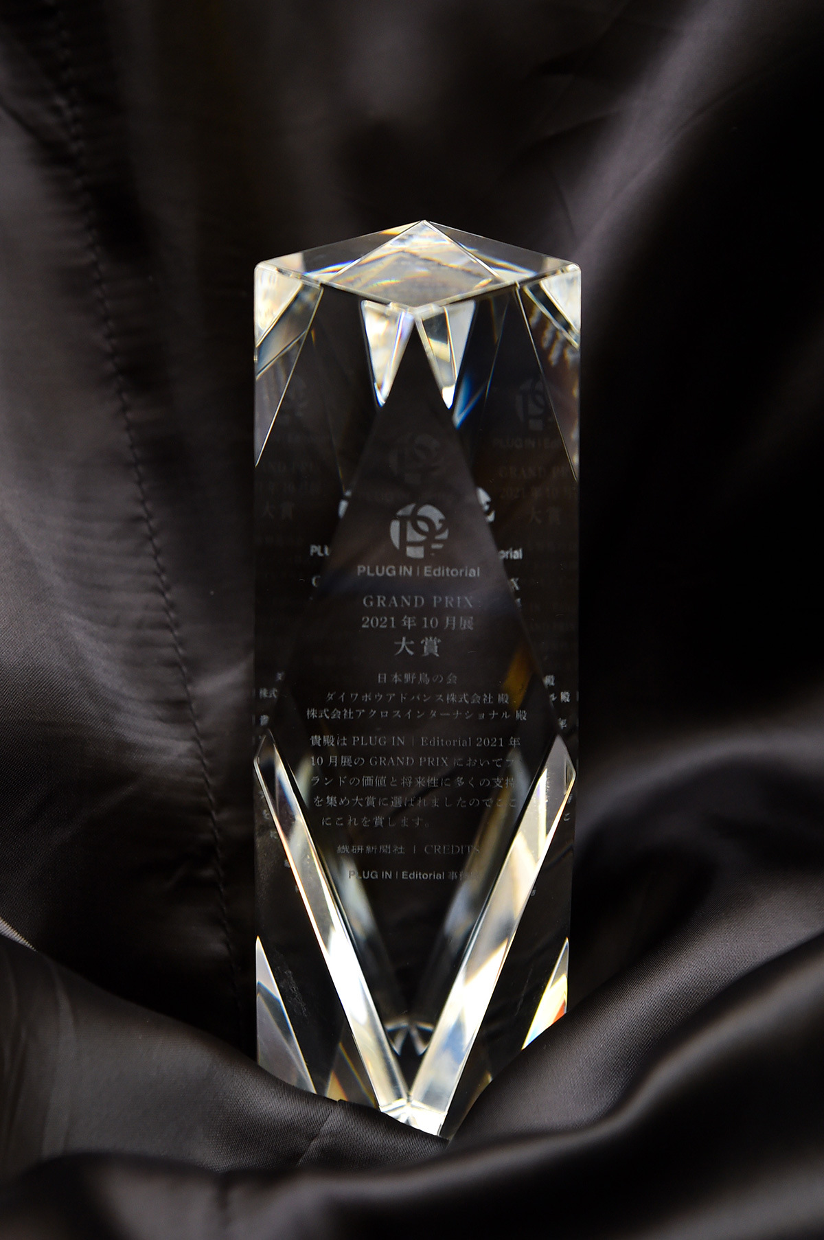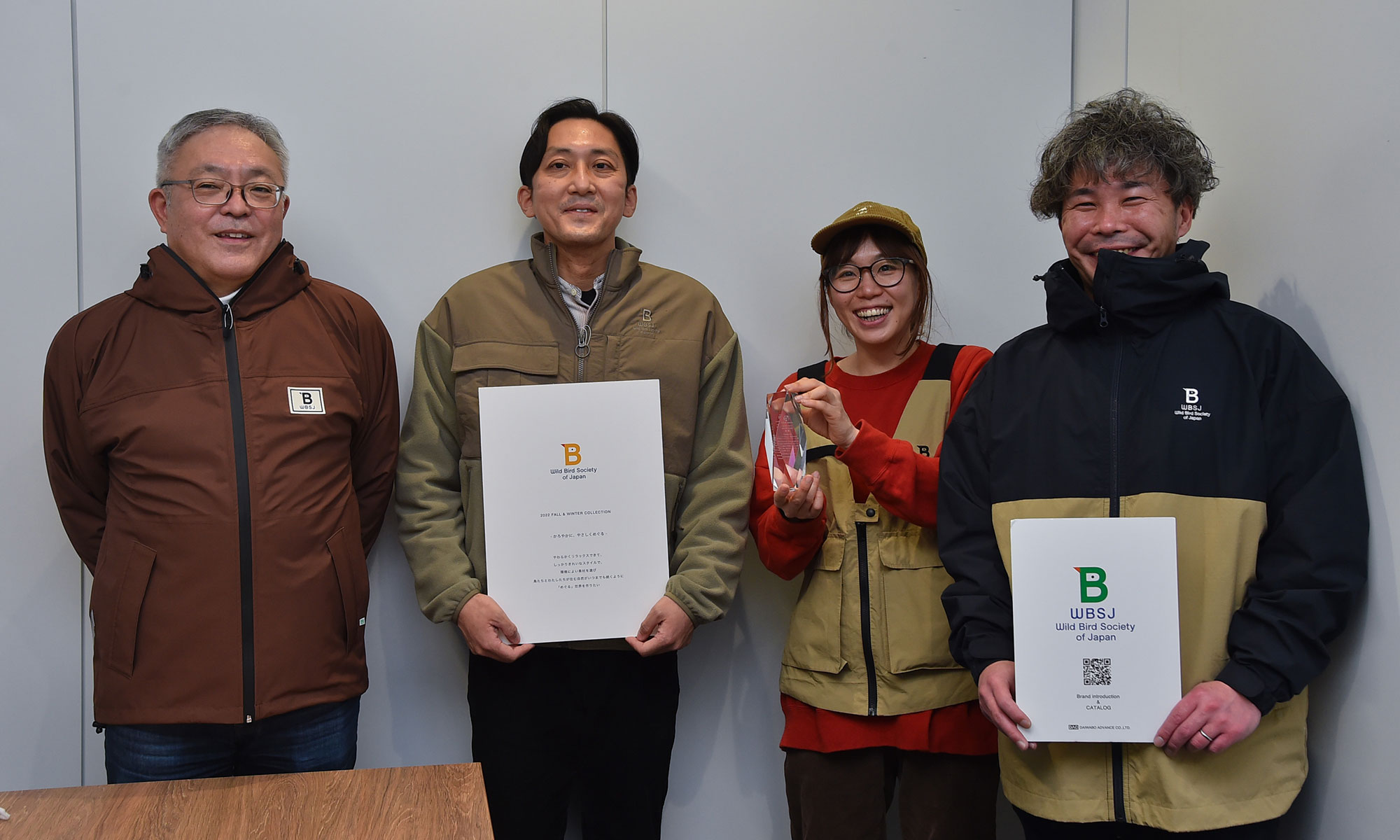 2021年10月に開催された合同展「PLUG IN│Editorial」(繊研新聞社とCREDITSの共催)で、来場者が印象に残った出展ブランドを選出する「PLUG IN│Editorialグランプリ」で、一位にダイワボウアドバンスの「日本野鳥の会」が輝いた。このほど記念品のトロフィーがチームに贈呈された。ブランドを監修する、こいしゆうかさん、営業部開発マネージャーの北村篤男さん、商品部企画課課長の佐藤淳さん、営業部の山田拓夫さんが受賞などの思いを語った。